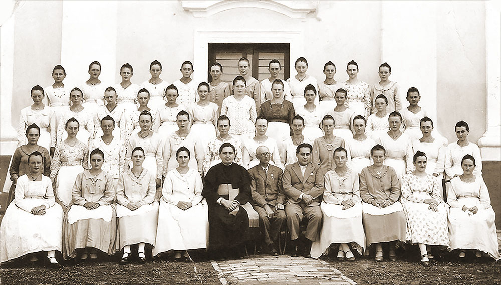1936 - "Mädchenkranz" mit Pfarrer Michael Willjung, Lehrer Johann Rech und Karl Zechmeister